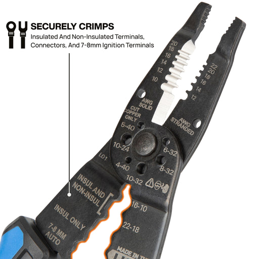 View full detailsProfessional wire stripper and crimping tool engineered for electricians; cuts and strips 10-20 AWG solid and 12-22 AWG stranded wire with precisio...